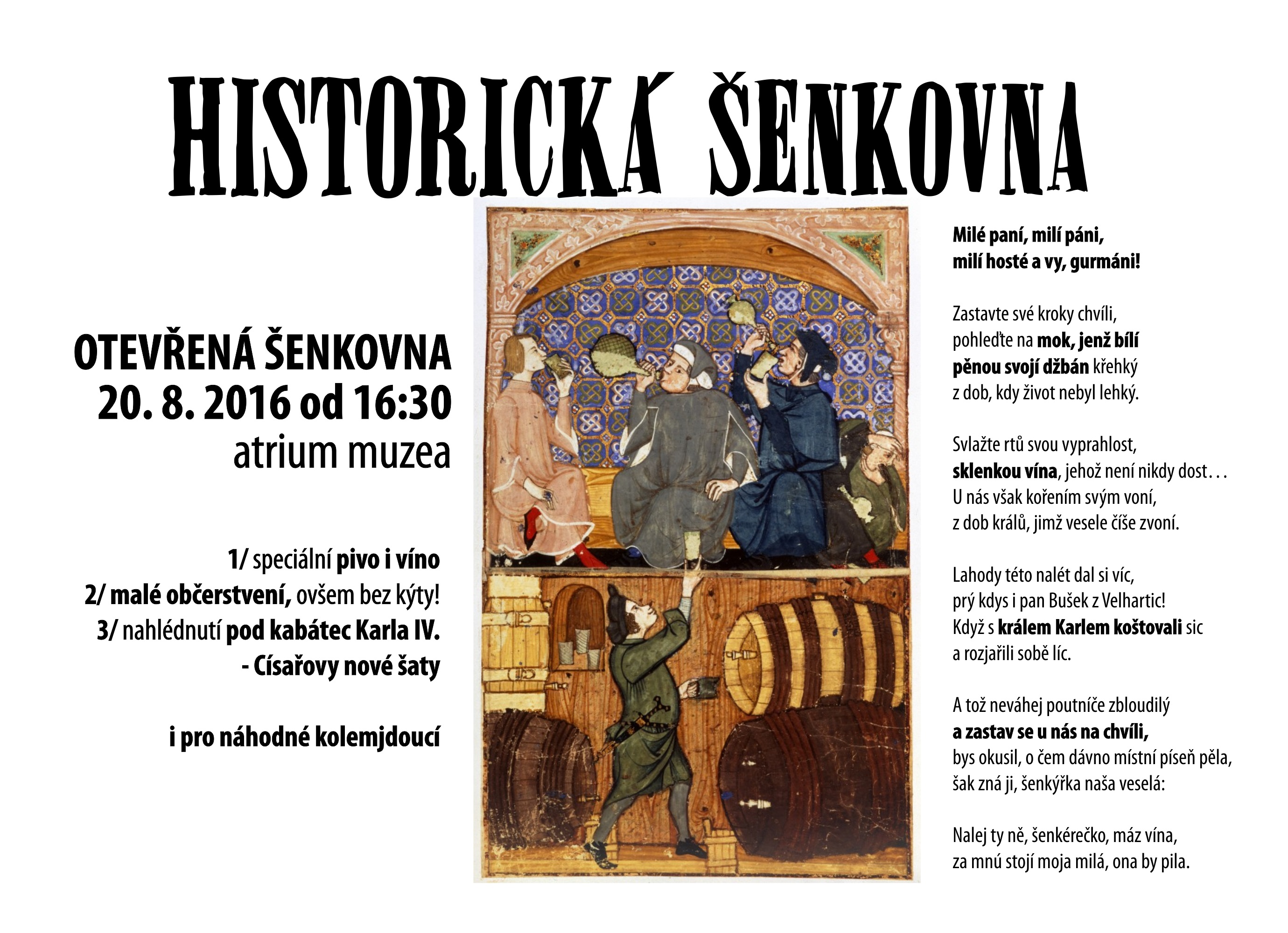Dobová medovina na přípitek, francouzská cibulová polévka, hovězí jazyk se skořicovou omáčkou nebo pečená masa s omáčkami jance, zázvorovou a švestkovou, dále lotrinský masový koláč, risoles (předchůdce karbanátků) a sladká varmuže (rozvařené ovoce). Po osmi chodech dobově ředěné víno, v šenkovni pak tmavé pivo či kořeněné víno… To vše se nyní peče, vaří a mísí pro více jak 170 předem rezervovaných návštěvníků akce, rozdělených do 3 turnusů (17.00, 18.30 a 20.00). Každý turnus je rozdělen ještě na poloviny, takže k historické tabuli přisedne vždy asi 30 návštěvníků akce. Každému bude přidělena role z královského dvora nebo hodovní síně (např. šenkýř, pokraječ apod.). Druhou polovinu čeká neméně zajímavý souběžný edukační a zábavný program spojený s přednáškou o historickém odívání (doc. Martina Hřibová), projekcí krátkého, pro hostinu speciálně natočeného filmu (Mgr. Marie Kadlčíková) a malou výstavou o historii místního hradu a jeho reálií (Mgr. Radek Tomeček). Přestože jídla jsou koncipována ve francouzském a italském stylu (především jde o jídla, která měl Karel IV. rád nebo která jsou doložena z historických pramenů), celá akce chce přiblížit nejen hodování nobility, ale i prostého lidu (sviňská pečeně opékaná atriu muzea v ceně!). Pro náhodné kolemjdoucí pocestné bez rezervovaných lístků je pak k dispozici toulavá kavárna „U Staré lucerny“, taktéž v muzejním atriu. Kořeněné víno zde může připomenout třeba i vinné rozjímání Buška z Velhartic…