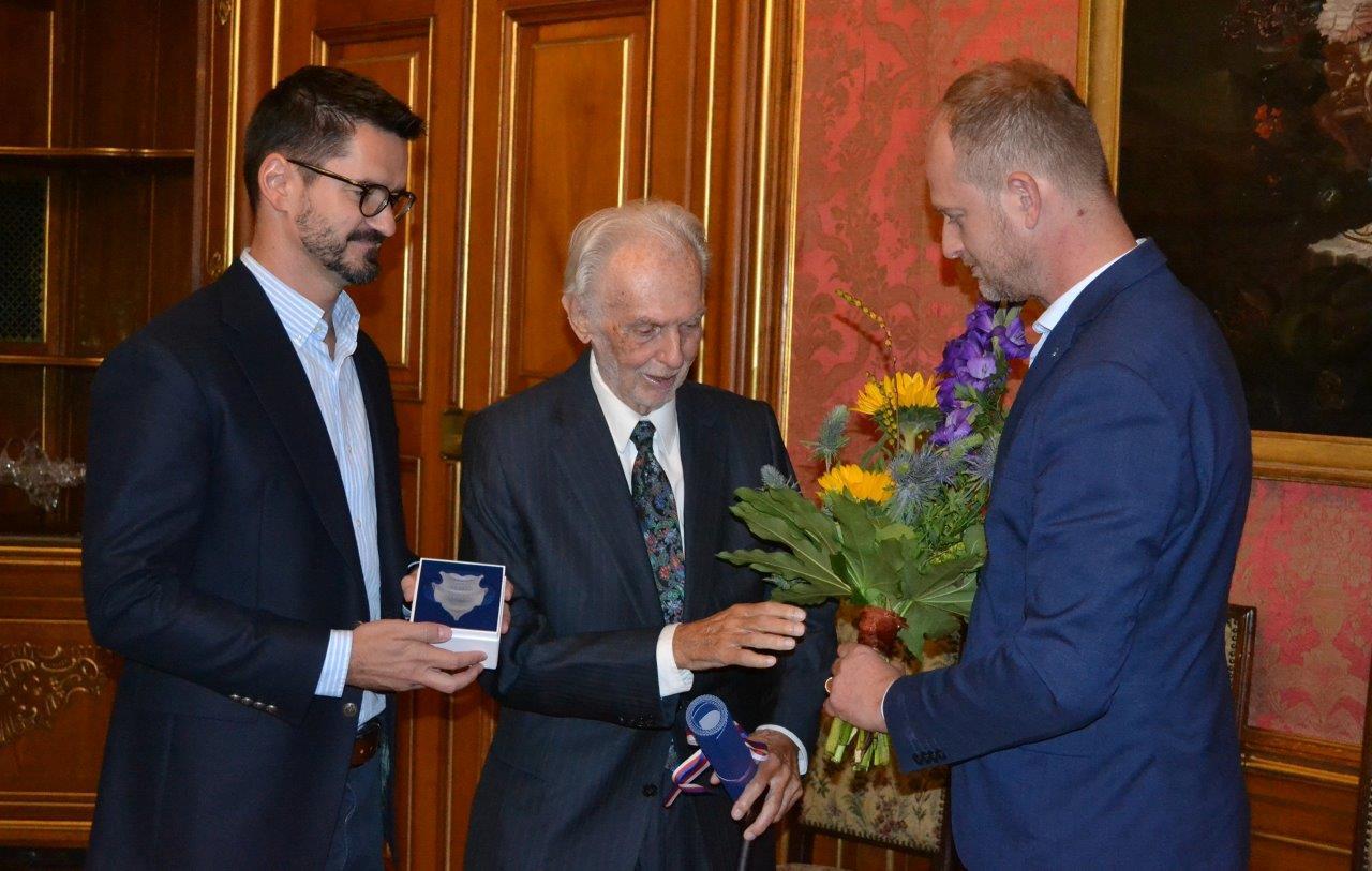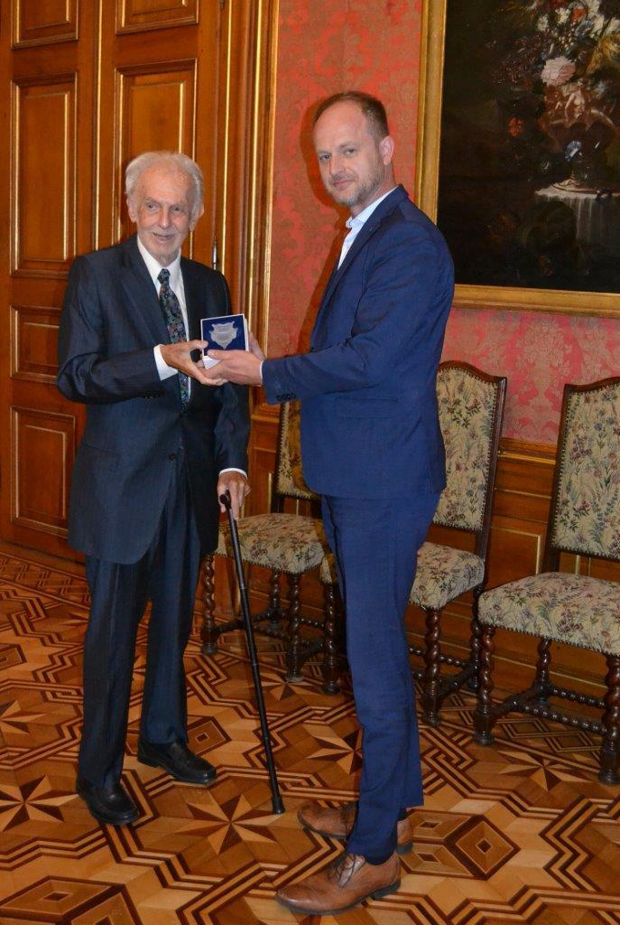 Britský režisér Brian Large, světově uznávaná osobnost televizní režie opery a klasické hudby, převzal v Nostickém paláci medaili Artis Bohemiae Amicis.