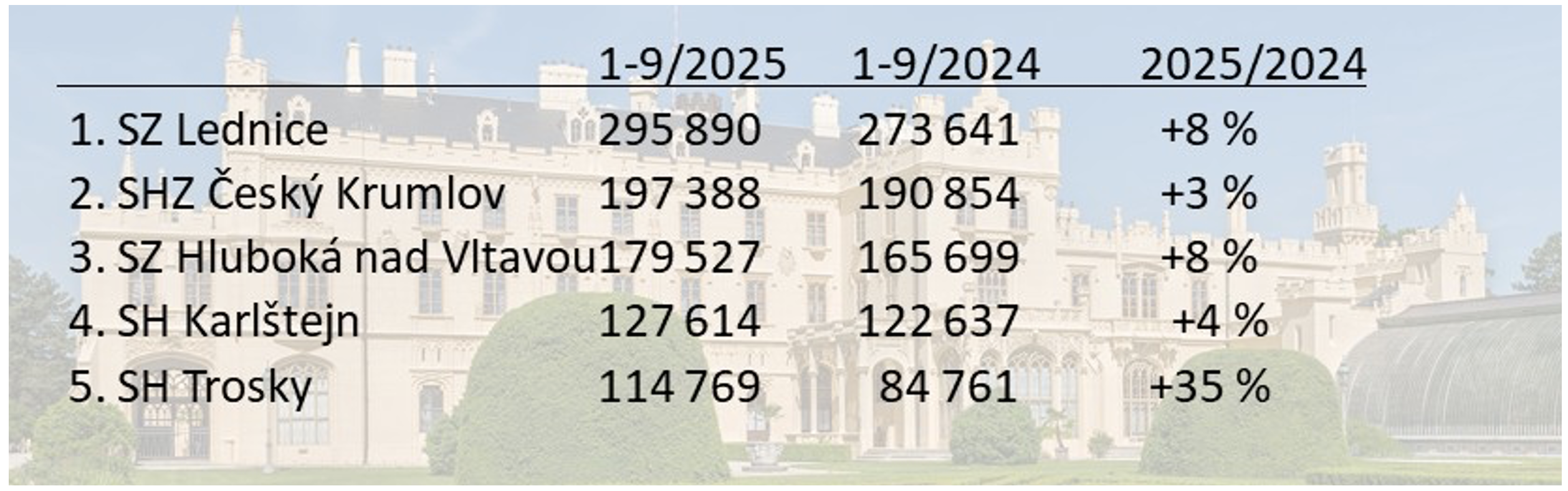 Nejnavštěvovanějším objektem NPÚ za prvních devět měsíců letošního roku byl s 295 tisíci návštěvníky státní zámek Lednice. Následují tradičně státní hrad a zámek Český Krumlov, státní zámek Hluboká, státní hrad Karlštejn a letos také státní hrad Trosky.