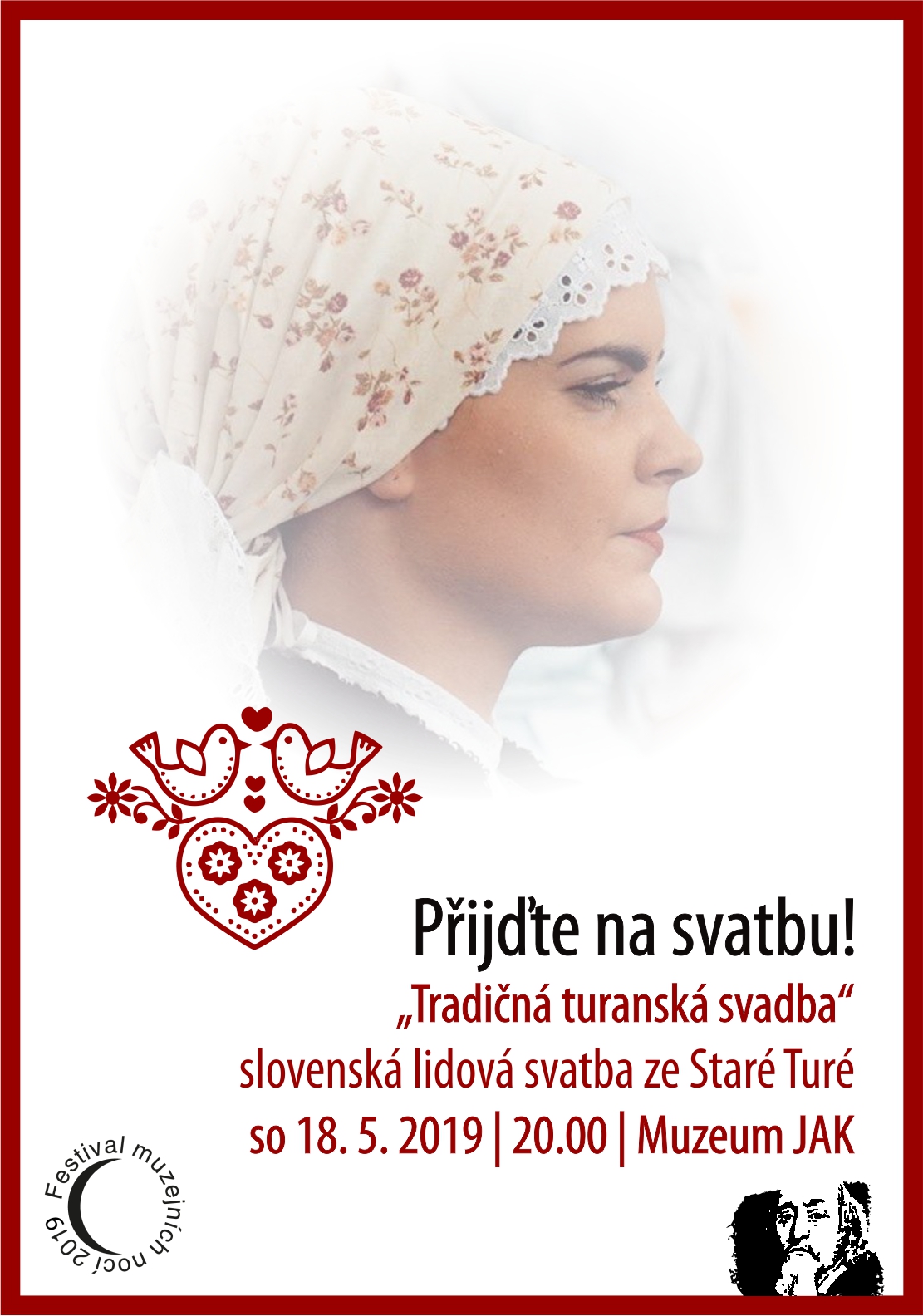 Tentýž den, 18. května, muzeum v rámci letošního Festivalu muzejních nocí nabízí nejen otevřené expozice a novou výstavu (zdarma přístupné do 23.00 hodin), ale též další představení z cyklu Přijďte na svatbu! Pro letošní 12. ročník přijala pozvání folklorní skupina ze Staré Turé na Slovensku, která v atriu muzea ve 20.00 představí „Tradičnú turanskú svadbu“. Jde o další z řady rekonstrukcí lidové svatby, která originálním způsobem obměňuje společné prvky všem lidovým svatbám – odprošování rodičů, náboženský obřad, společná hostina s typickým zvykoslovím a zábavnými hrami, čepení nevěsty a volnou zábavu. Kdo na svatbu skutečně přijde, bude mít možnost ochutnat tradiční turanské pečivo i pálenku. Pohoštění pro návštěvníky zajišťuje mj. i nová Muzejní kavárna.