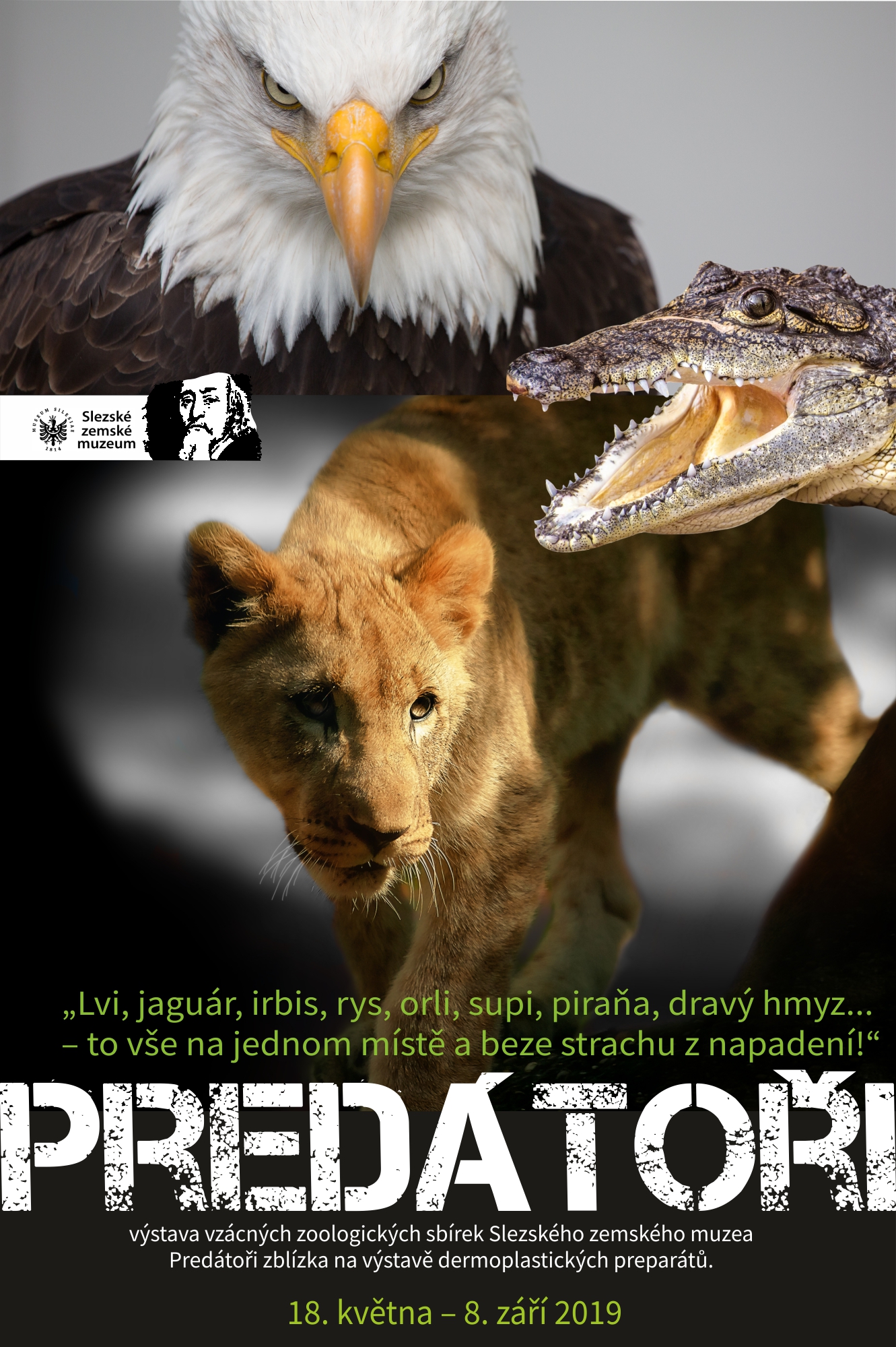 Návštěvníků muzea je tento den od 9.00 zdarma zpřístupněna nová výstava dravců v jejich širokém živočišném spektru – Predátoři. Děti i rodiče se tak mohou pomocí vzácných zoologických sbírek zapůjčených ze Slezského zemského muzea v Opavě (SZM) seznámit s rozmanitostí druhů živočichů různých kontinentů na souši, ve vodě i ve vzduchu, jejichž způsob obživy je lov a kořist. Uvidí na vlastní oči lva, jaguára, irbise, rysa, orly, supy, piraňu, dravý hmyz a další. Dětským očím nabízí výstava také zajímavé výtvarné řešení, zvídavým a dospělým návštěvníkům výstava poskytuje důležité texty k bližšímu seznámení se. Výstava je veřejnosti volně zpřístupněna na Mezinárodní den muzeí (18. května) do 16.00 hodin, trvá až do letošních Dnů evropského dědictví, kdy muzeum znovu zpřístupní výstavu zdarma 8. září 2019. Autorsky výstavu připravil kurátor zoologického pracoviště SZM Mgr. Martin Gajdošík, Ph.D.
