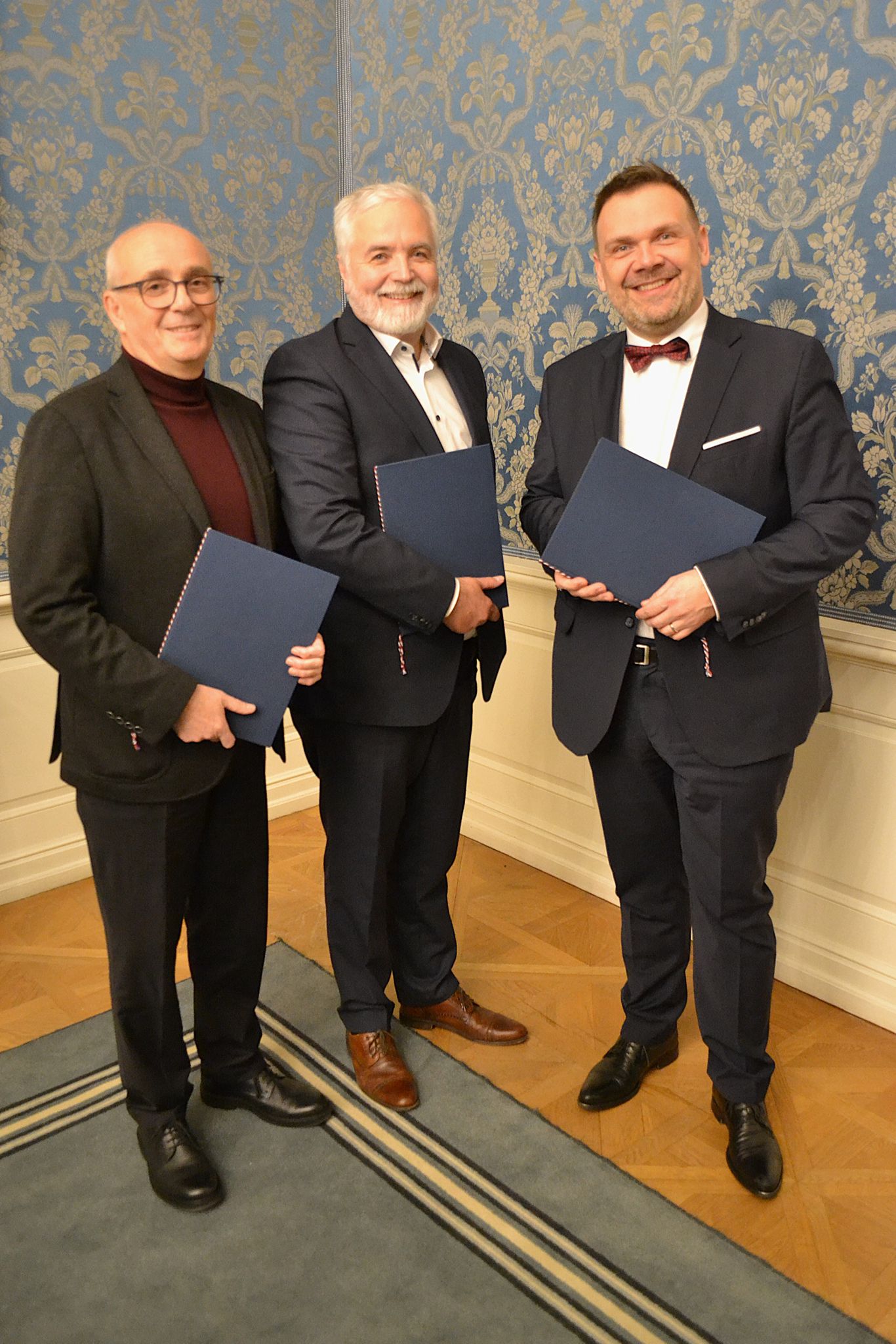 Ministr kultury v demisi Martin Baxa, prezident Herecké asociace Ondřej Kepka a generální ředitel Národního divadla Jan Burian podepsali Memorandum o spolupráci při zajištění 33.– 35. ročníku Cen Thálie.